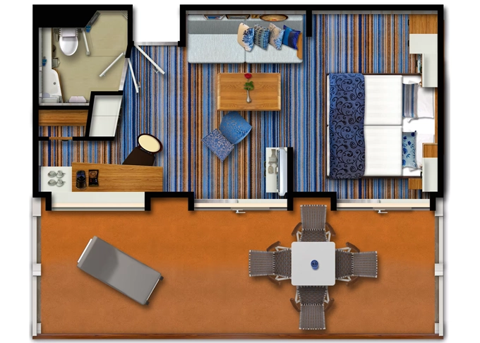 | SUTO - Themen Suite 54 m² + balkon 15 m² se stolem, lehátkom a houpací sítí. Ložnice, Obývací část, šatník. 10. paluba. Max 4 osoby. Výhody Suite. | 129 619 Kč 64 809 Kč za osobu | ||
