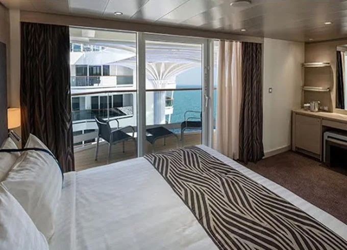 Kajuta s balkónem: 16 - 17 m², kajuta s manželskou postelí (na požádání 2 oddělené postele) a rozkládací pohovka. Klimatizace, koupelna se sprchou nebo vanou a WC, toaletní stolek, prostorná skříň, interaktivní TV, telefon, sejf, vysoušeč vlasů, virtuální asistentka ZOE. Balkony se stolkem a židlemi. Některé kajuty mají omezený výhled; kajuty PR1, PR2, PR3, PV mají výhled na promenádu.